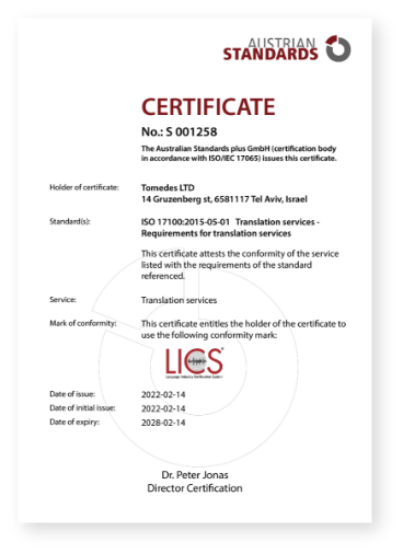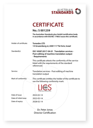 With this ISO certification, we at Tomedes can assure you that our machine translation work is handled and post-edited by specialists, allowing you to reap the benefits without any compromise to quality.
